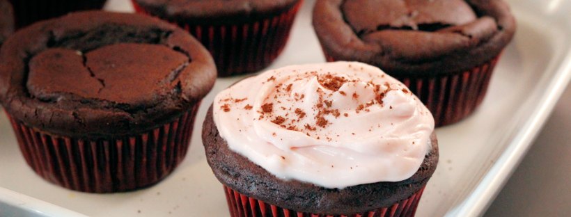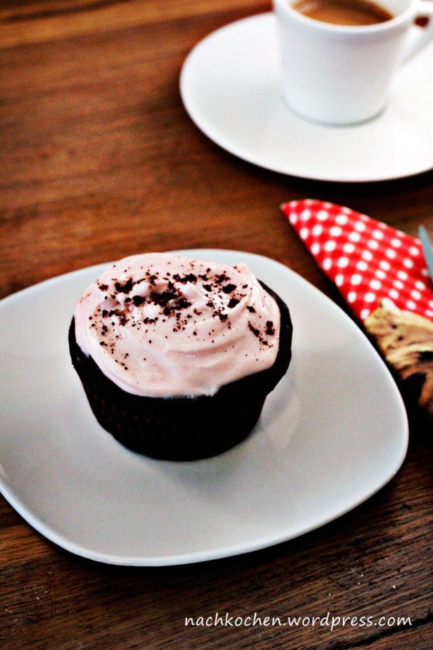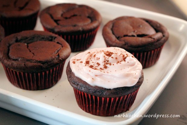 Diese Cupcakes kann man auch gut und gerne auch als Muffins (also ohne Topping) servieren. Die schmecken auch am nächsten Tag wunderbar saftig, schokoladig.