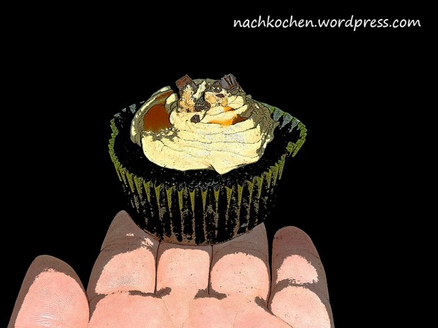 Ich hab mich nur der Idee und dem How-To bedient, denn die amerikanischen Rezepte sind mir oft zu süß. Das Topping habe ich zuerst mit einer Lochtülle aufdressiert, aber ein Schokobrauner-Überzug würde doch sehr an etwas anderes ähneln 😉 Also habe ich dann nach 3 Cupcakes zu einer Sterntülle gewechselt. Das Schöne an Überzogene Cupcakes ist, das man beim Transport keine sehr großen Sorgen um das Topping machen muss.