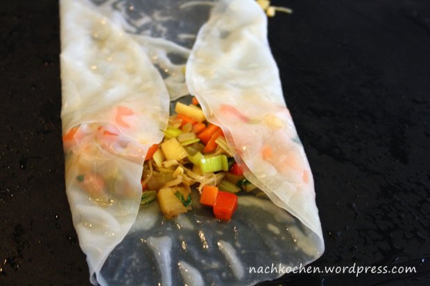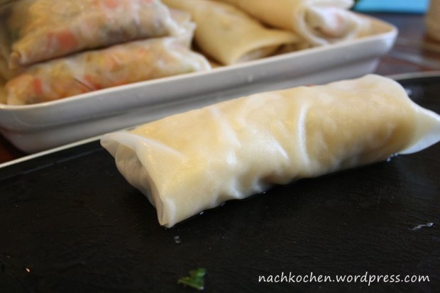 Das schwierigste ist das eigentliche Rollen und Verpacken. Wir hatten vorgefertigte Reisteigplatten gekauft. Man kann auch den Teig bestimmt selber machen, aber man muss es auch nicht übertreiben.