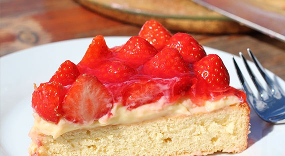 To celebrate this Sunday (today it’s consistent with its namesake) I baked my favorite cake: strawberry cake with sponge and custard. Normally I like to bake a cake in small 18 cm baking pans, but for strawberry cake I prefer slightly larger pans 😉 MORE CAKE! The recipe for the sponge cake I found at „Frag Mutti“ (ask mom). I used the amount recommended for a 26cm baking pan, but the finished sponge was quite high. Almost thicker than the strawberry layer. I like it better when the ground is slightly thinner. Next time I’ll convert the recipe down to 2 eggs and possibly use larger strawberries. Although I have dozens of different baking pans, I don’t have a „pie crust“ shape, so I used a springform pan. In the comments someone said, you should not grease the mold and there would automatically form an edge (because its stuck to the sides) while baking, but apparently the non-stick coating of my springform pan is obviously still in great shape. That’s probably why my sponge had no raised edges. If you want a „clean“ strawberry cake, you should use a cake ring for assembling the topping. I didn’t have one handy, but I like it when it looks a little bit rustic ;).