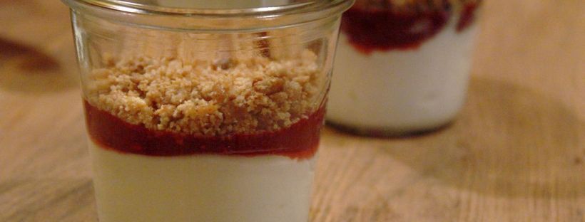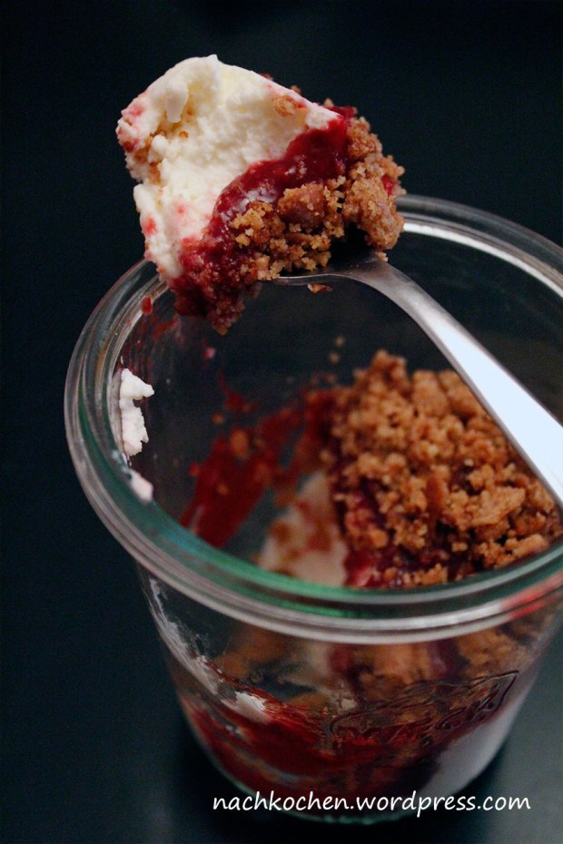 Die Marsala-Himbeer-Sauce auf die Gläser verteilen und mit den Kekskrümeln bedecken. Die Gläser verschließen oder gleich verspeisen.