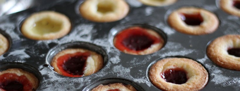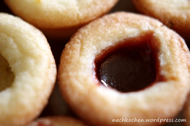 Die Arbeitsfläche und das Nudelholz bemehlen und den Teig ca. 0,5 cm dünn ausrollen. Je nach verwendetet Form Kreise ausstechen und die vorbereitete Förmchen damit auskleiden, überstehenden Teig abschneiden. Die Törtchen mit Marmelade füllen (1 TL bzw. EL je nach Größe reicht) und für 10-15 Minuten backen, bis die schön gold-braun sind. Vorsicht beim Herausnehmen aus dem Ofen. Die Marmelade wird sehr heiß! Abkühlen lassen und vorsichtig aus der Form lösen und auskühlen lassen vor dem servieren.