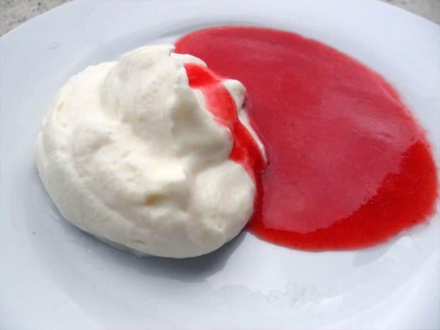 Die Erdbeersauce neutralisiert etwas von der Süße der Creme und erinnert geschmacklich an Spagetti Eis. Ich mags am liebsten mit viel Sauce :). Kiwi- oder Mango-Sauce passt auch sehr gut.