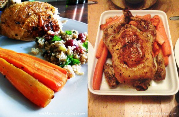 Nun zum Endresultat… das Hähnchen war perfekt gegart, saftig und fiel formlich von den Knochen. Der Couscous mit den Kirschen und Zimt passte wirklich sehr gut dazu und war auch eigentlich sehr lecker, aber … ich weiß nicht, für meinen (empfindlichen) Geschmack hatte es einen ganz leichten undefinierbaren Nachgeschmack. Entweder war es zu viel Zitronenabrieb (1 ganze Zitrone) oder die Zimtstange war zu lange im Couscous, da nichts angegeben wurde habe ich die Stange erst zum Servieren herausgenommen. Urteil der Testesser: insgesamt sehr lecker! Couscous wird es wohl jetzt auch öfters geben.