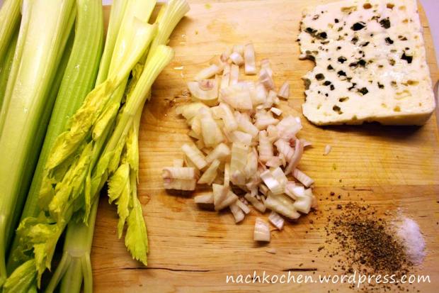Kennt Ihr die Sendung „Zu Tisch in…“ bei Arte. Die haben online auch die Rezepte zu den einzelnen Sendungen. Ich habe dort auch eine Verwertungsmöglichkeit für Staudensellerie und Schimmelkäse gefunden. Ich weiß nicht was mich geritten hat als ich den Roquefort gekauft habe. Wahrscheinlich für ein anderes Rezept. Aber wenn etwas schimmelt gehört es nicht auf den Teller, sondern in den Müll. Naja, man soll ja nicht sagen, dass ich nicht experimentierfreudig bin 😉 Das Rezept ist eine Selleriesuppe mit Stilton, da ich keinen Stilton hatte und habe ich den Roquefort genommen.